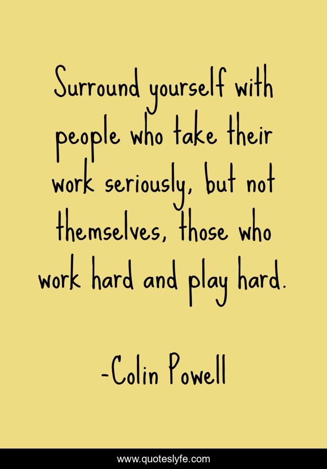 This page presents the quote "Surround yourself with people who take their work seriously, but not themselves, those who work hard and play hard.". Author of this quote is Colin Powell. This quote is about work hard, yourself,.