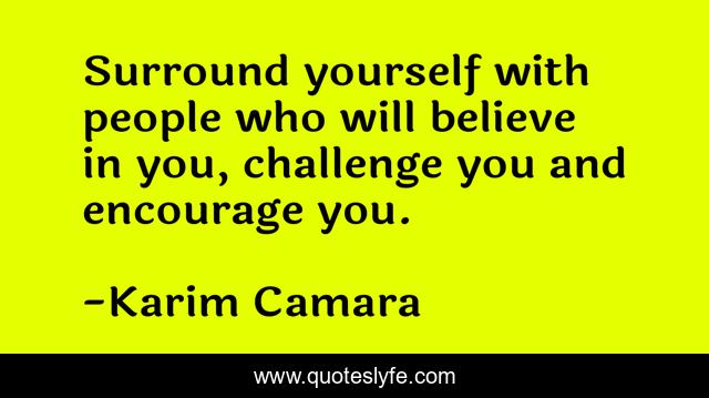 This page presents the quote "Surround yourself with people who will believe in you, challenge you and encourage you.". Author of this quote is Karim Camara. This quote is about karim-camara, spiritual-growth, spiritual-development, spiritual-wisdom,.