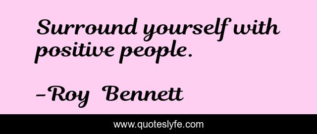 This page presents the quote "Surround yourself with positive people.". Author of this quote is Roy Bennett. This quote is about life, being-positive, positive-affirmation, confidence, optimism, positive-life, optimistic, inspirational, positive,.