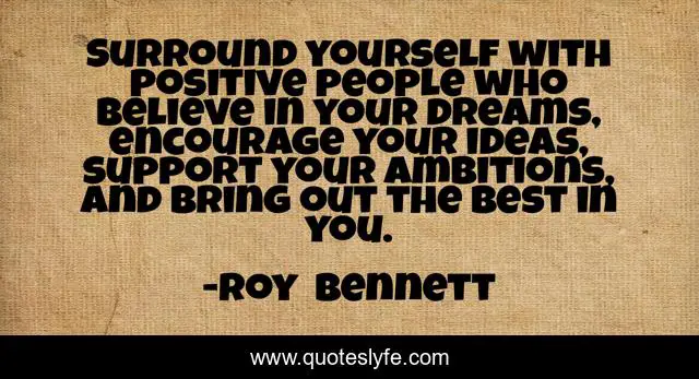 This page presents the quote "Surround yourself with positive people who believe in your dreams, encourage your ideas, support your ambitions, and bring out the best in you.". Author of this quote is Roy Bennett. This quote is about life, optimism, ambitions, being-positive, positive-affirmation, confidence, encouragement, ideas, optimistic,.