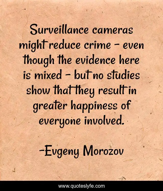 This page presents the quote "Surveillance cameras might reduce crime - even though the evidence here is mixed - but no studies show that they result in greater happiness of everyone involved.". Author of this quote is Evgeny Morozov. This quote is about crime, here, surveillance,.