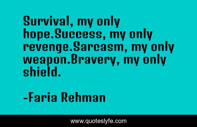 This page presents the quote "Survival, my only hope.Success, my only revenge.Sarcasm, my only weapon.Bravery, my only shield.". Author of this quote is Faria Rehman. This quote is about survival, sucess, bravery,.