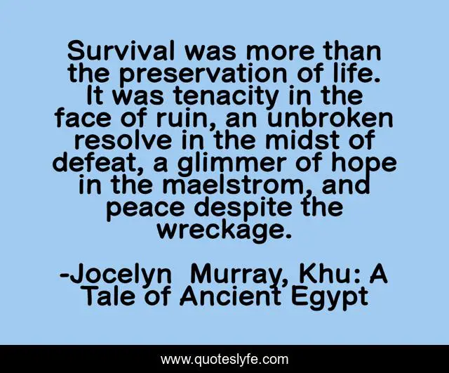 This page presents the quote "Survival was more than the preservation of life. It was tenacity in the face of ruin, an unbroken resolve in the midst of defeat, a glimmer of hope in the maelstrom, and peace despite the wreckage.". Author of this quote is Jocelyn Murray, Khu: A Tale of Ancient Egypt. This quote is about death, survival, unbroken-warrior, peace, tenacity, hope, defeat,.