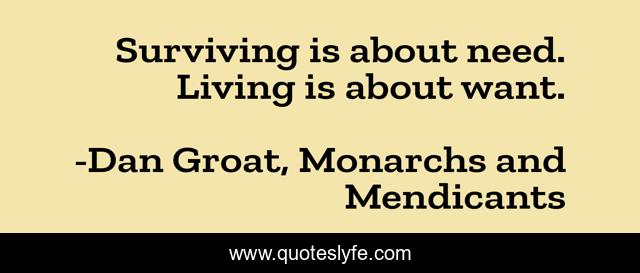 This page presents the quote "Surviving is about need. Living is about want.". Author of this quote is Dan Groat, Monarchs and Mendicants. This quote is about wants, needs, surviving, survival, survived, survive, need, wanting, needs-and-wants,.