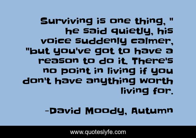 This page presents the quote "Surviving is one thing, " he said quietly, his voice suddenly calmer, "but you've got to have a reason to do it. There's no point in living if you don't have anything worth living for.". Author of this quote is David Moody, Autumn. This quote is about reason, living, life, survival,.