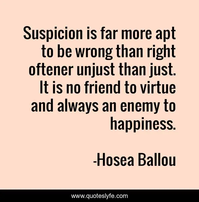 This page presents the quote "Suspicion is far more apt to be wrong than right oftener unjust than just. It is no friend to virtue and always an enemy to happiness.". Author of this quote is Hosea Ballou. .