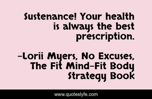 This page presents the quote "Sustenance! Your health is always the best prescription.". Author of this quote is Lorii Myers, No Excuses, The Fit Mind-Fit Body Strategy Book. This quote is about health, prescription,.
