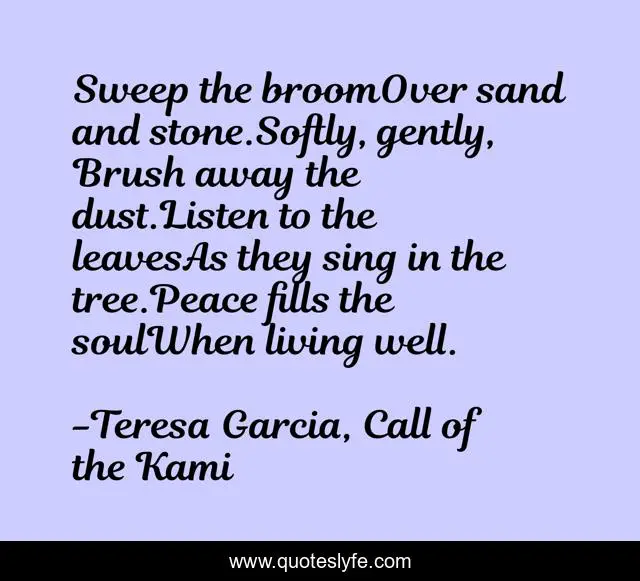 This page presents the quote "Sweep the broomOver sand and stone.Softly, gently, Brush away the dust.Listen to the leavesAs they sing in the tree.Peace fills the soulWhen living well.". Author of this quote is Teresa Garcia, Call of the Kami. This quote is about enthusiasm, meditation, inspirational,.