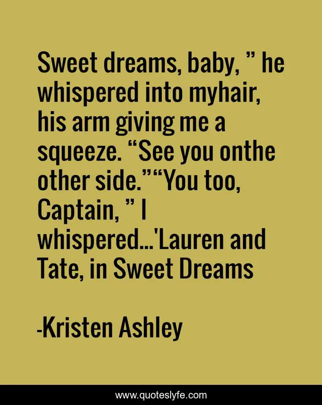 This page presents the quote "Sweet dreams, baby, ” he whispered into myhair, his arm giving me a squeeze. “See you onthe other side.”“You too, Captain, ” I whispered...'Lauren and Tate, in Sweet Dreams". Author of this quote is Kristen Ashley. This quote is about cuddling, lovers, dreams,.