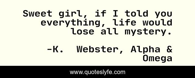 This page presents the quote "Sweet girl, if I told you everything, life would lose all mystery.". Author of this quote is K. Webster, Alpha & Omega. This quote is about angels-and-demons, alpha-and-omega, guardian-angels, alpha-male, angel-paranormal-romance, inspirational, alpha, enthusiasm, angels,.