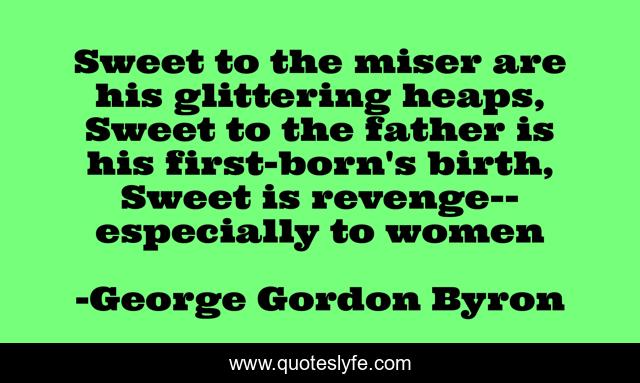 This page presents the quote "Sweet to the miser are his glittering heaps, Sweet to the father is his first-born's birth, Sweet is revenge--especially to women". Author of this quote is George Gordon Byron. This quote is about sweet, to-each-his-own, revenge, women,.