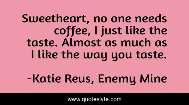 This page presents the quote "Sweetheart, no one needs coffee, I just like the taste. Almost as much as I like the way you taste.". Author of this quote is Katie Reus, Enemy Mine. This quote is about urban-fantasy, paranormal-romance, wolf-shifter-romance, vampire-romance,.