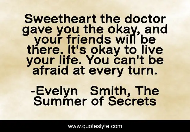 This page presents the quote "Sweetheart the doctor gave you the okay, and your friends will be there. It's okay to live your life. You can't be afraid at every turn.". Author of this quote is Evelyn Smith, The Summer of Secrets. This quote is about mothers-and-daughters, inspirational-living,.