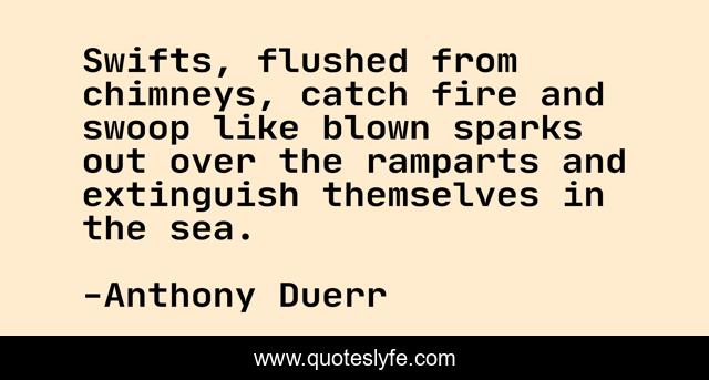 This page presents the quote "Swifts, flushed from chimneys, catch fire and swoop like blown sparks out over the ramparts and extinguish themselves in the sea.". Author of this quote is Anthony Duerr. This quote is about birds, war,.