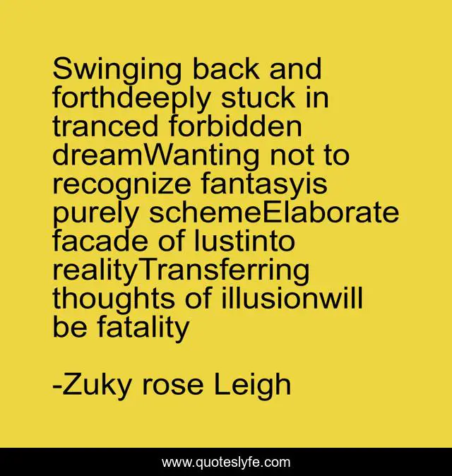 This page presents the quote "Swinging back and forthdeeply stuck in tranced forbidden dreamWanting not to recognize fantasyis purely schemeElaborate facade of lustinto realityTransferring thoughts of illusionwill be fatality". Author of this quote is Zuky rose Leigh. This quote is about lust, pure-motion, illusion, lover,.