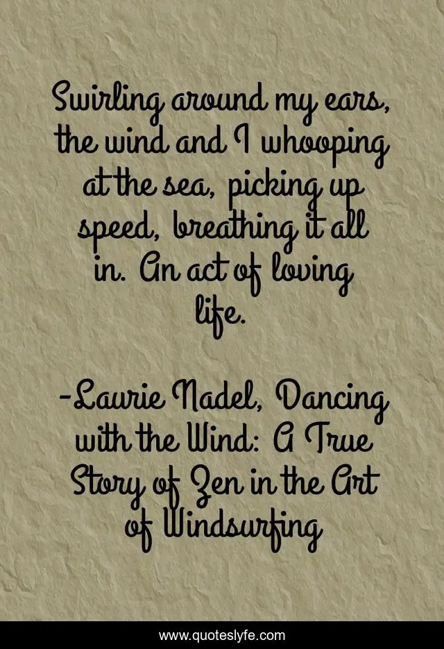 This page presents the quote "Swirling around my ears, the wind and I whooping at the sea, picking up speed, breathing it all in. An act of loving life.". Author of this quote is Laurie Nadel, Dancing with the Wind: A True Story of Zen in the Art of Windsurfing. This quote is about life, love-life, quote-of-the-day, dan-rather, wayne-dyer, sea-life, inspirational, quote-about-life, enthusiasm,.