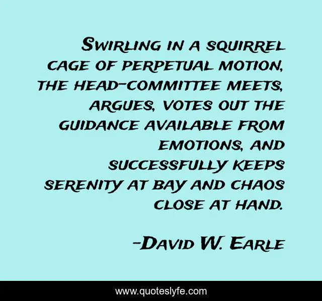 This page presents the quote "Swirling in a squirrel cage of perpetual motion, the head-committee meets, argues, votes out the guidance available from emotions, and successfully keeps serenity at bay and chaos close at hand.". Author of this quote is David W. Earle. This quote is about love, recovery, family, communication, chaos, feelings, affection, dysfunction,.