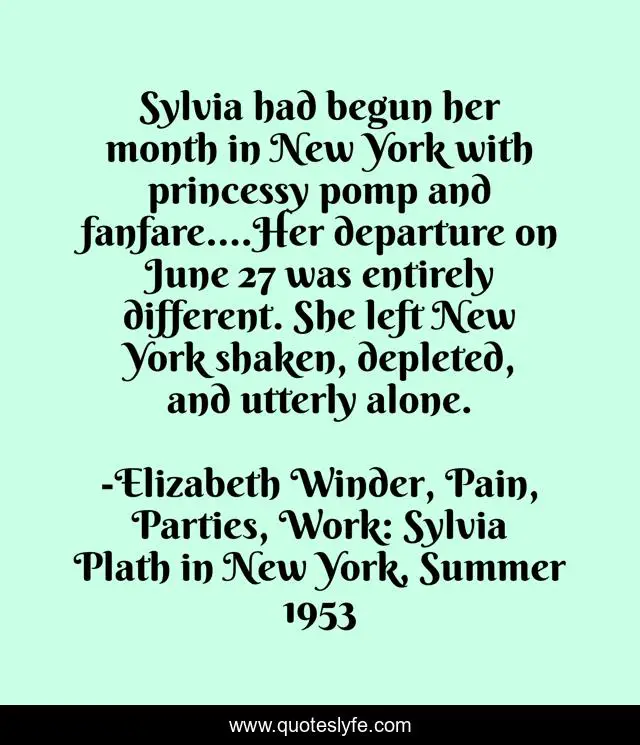 "Elizabeth Winder, Pain, Parties, Work: Sylvia Plath in New York, Summer 1953 Quotes." Quoteslyfe.com, 2025. Tue. 09 Dec. 2025. <https://www.quoteslyfe.com/quote/Sylvia-had-begun-her-month-in-New-114177>.