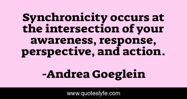 This page presents the quote "Synchronicity occurs at the intersection of your awareness, response, perspective, and action.". Author of this quote is Andrea Goeglein. This quote is about synchronicity, perspective, action, intersection, response, awareness,.
