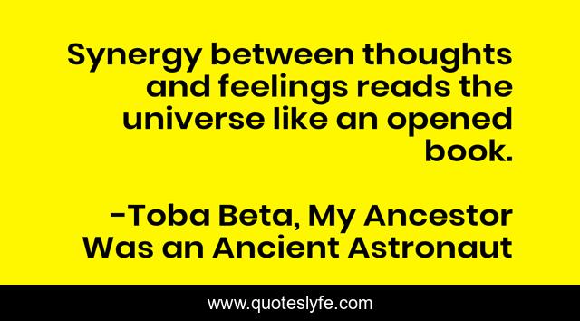 This page presents the quote "Synergy between thoughts and feelings reads the universe like an opened book.". Author of this quote is Toba Beta, My Ancestor Was an Ancient Astronaut. This quote is about opened-book, synergy, feelings, thoughts, universe,.