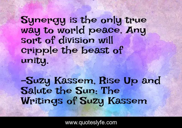 This page presents the quote "Synergy is the only true way to world peace. Any sort of division will cripple the beast of unity.". Author of this quote is Suzy Kassem, Rise Up and Salute the Sun: The Writings of Suzy Kassem. This quote is about united, love, peace, unity, synergy, world-peace, affection, togetherness,.