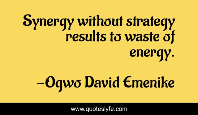 This page presents the quote "Synergy without strategy results to waste of energy.". Author of this quote is Ogwo David Emenike. This quote is about business, marketing, collaboration, team-spirit, strategy, synergy, teamwork, plan, cooperation,.