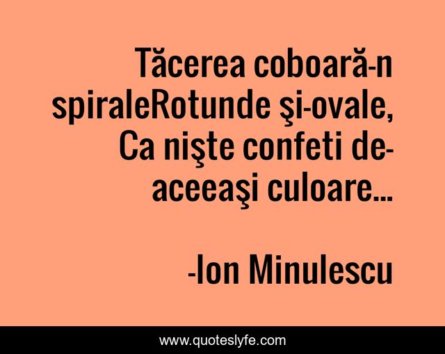 This page presents the quote "Tăcerea coboară-n spiraleRotunde şi-ovale, Ca nişte confeti de-aceeaşi culoare...". Author of this quote is Ion Minulescu. .