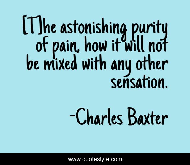 This page presents the quote "[T]he astonishing purity of pain, how it will not be mixed with any other sensation.". Author of this quote is Charles Baxter. This quote is about pain, purity, sensation,.
