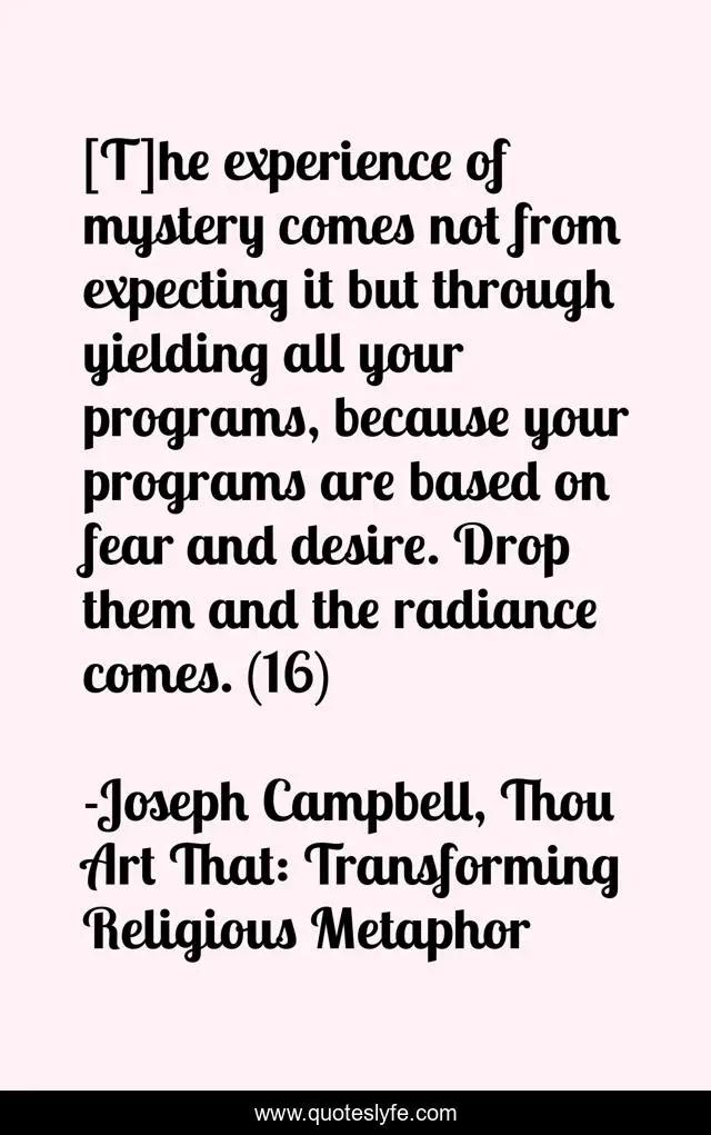 This page presents the quote "[T]he experience of mystery comes not from expecting it but through yielding all your programs, because your programs are based on fear and desire. Drop them and the radiance comes. (16)". Author of this quote is Joseph Campbell, Thou Art That: Transforming Religious Metaphor. This quote is about desire, mystery, fear, acceptance, expectations,.