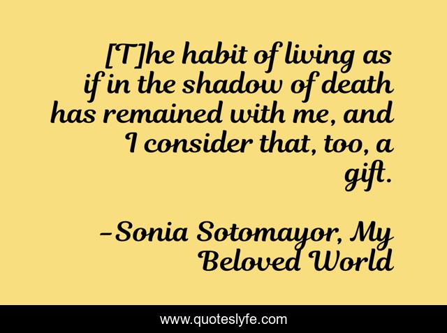This page presents the quote "[T]he habit of living as if in the shadow of death has remained with me, and I consider that, too, a gift.". Author of this quote is Sonia Sotomayor, My Beloved World. This quote is about mortality, diabetes,.