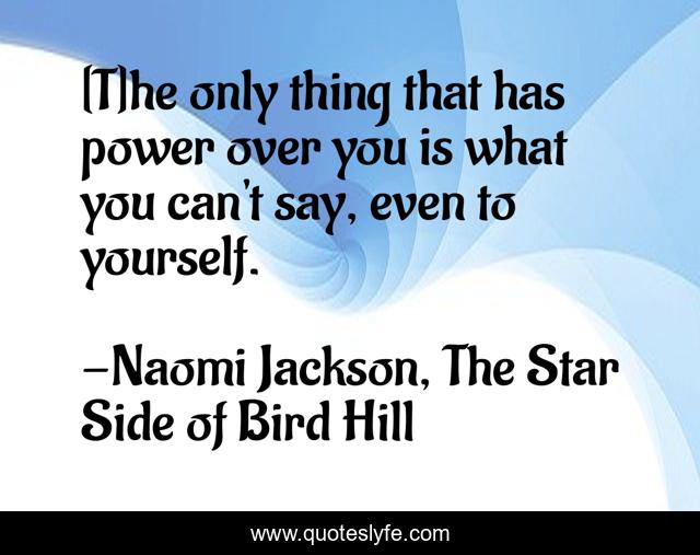 This page presents the quote "[T]he only thing that has power over you is what you can't say, even to yourself.". Author of this quote is Naomi Jackson, The Star Side of Bird Hill. This quote is about anger, fear, self-awareness,.