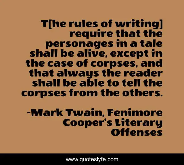 This page presents the quote "T[he rules of writing] require that the personages in a tale shall be alive, except in the case of corpses, and that always the reader shall be able to tell the corpses from the others.". Author of this quote is Mark Twain, Fenimore Cooper's Literary Offenses. This quote is about writing-craft, characters, writing,.
