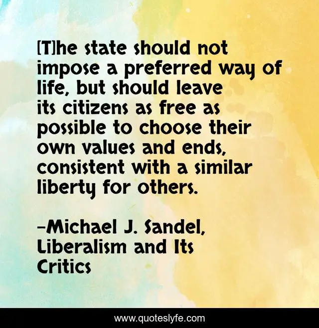 This page presents the quote "[T]he state should not impose a preferred way of life, but should leave its citizens as free as possible to choose their own values and ends, consistent with a similar liberty for others.". Author of this quote is Michael J. Sandel, Liberalism and Its Critics. This quote is about freedom, liberty, states, individuals, values, liberalism,.