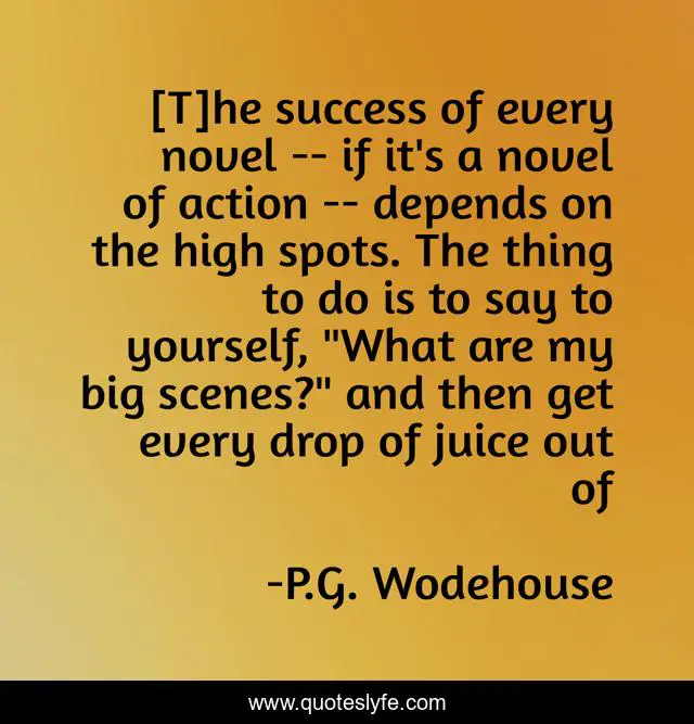 This page presents the quote "[T]he success of every novel -- if it's a novel of action -- depends on the high spots. The thing to do is to say to yourself, "What are my big scenes?" and then get every drop of juice out of". Author of this quote is P.G. Wodehouse. This quote is about creative-process, novels, focus, writing,.