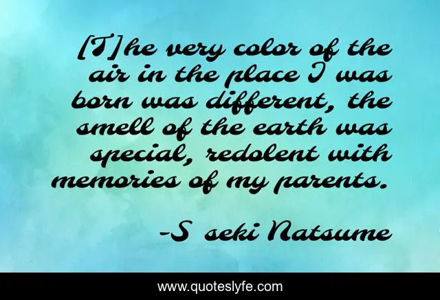 This page presents the quote "[T]he very color of the air in the place I was born was different, the smell of the earth was special, redolent with memories of my parents.". Author of this quote is Sōseki Natsume. This quote is about home, nostalgia,.