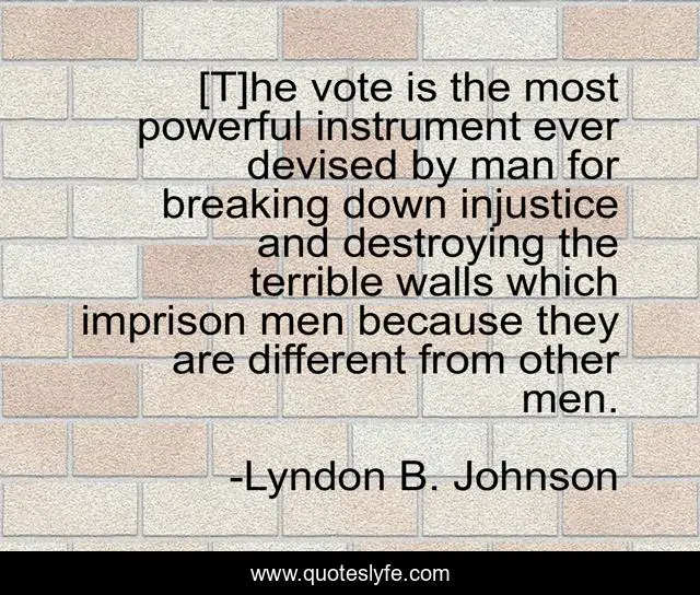 This page presents the quote "[T]he vote is the most powerful instrument ever devised by man for breaking down injustice and destroying the terrible walls which imprison men because they are different from other men.". Author of this quote is Lyndon B. Johnson. This quote is about lbj, voting, voting-rights-act, injustice,.