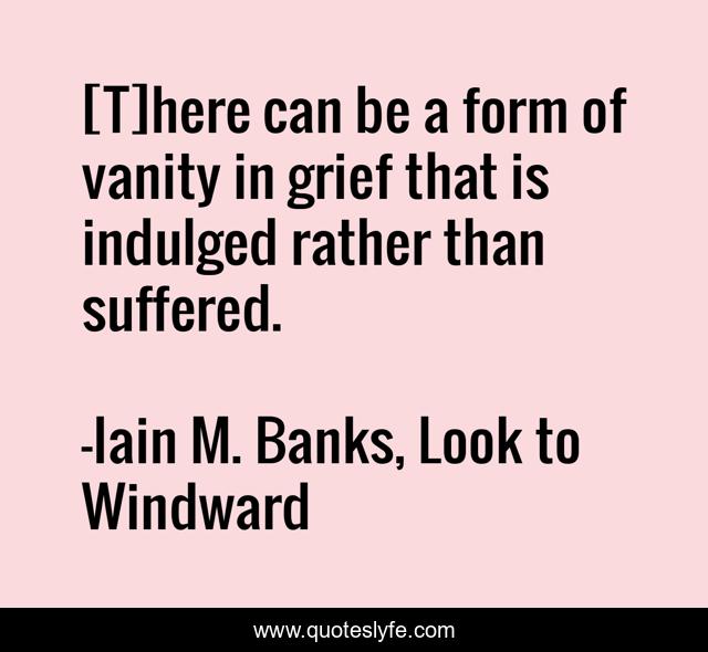 This page presents the quote "[T]here can be a form of vanity in grief that is indulged rather than suffered.". Author of this quote is Iain M. Banks, Look to Windward. This quote is about grief, self-pity, wallowing,.