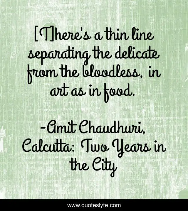 This page presents the quote "[T]here's a thin line separating the delicate from the bloodless, in art as in food.". Author of this quote is Amit Chaudhuri, Calcutta: Two Years in the City. This quote is about food, line, art, bloodless, delicate,.
