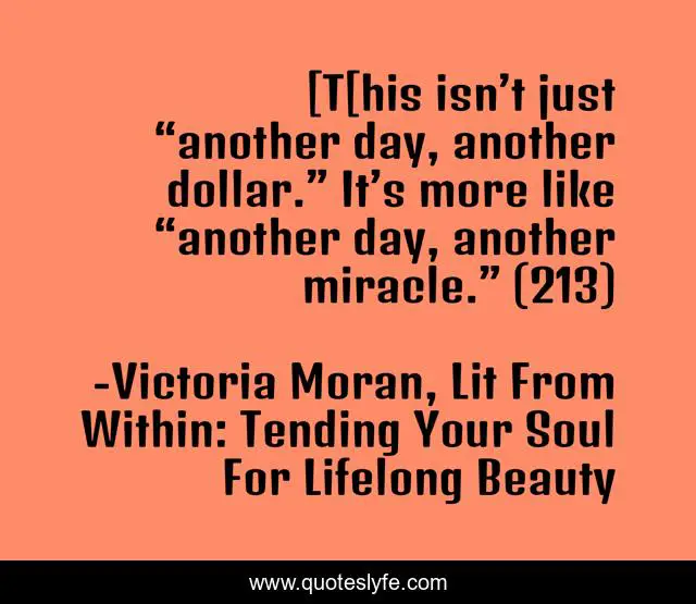 This page presents the quote "[T[his isn’t just “another day, another dollar.” It’s more like “another day, another miracle.” (213)". Author of this quote is Victoria Moran, Lit From Within: Tending Your Soul For Lifelong Beauty. This quote is about miracles, life, mindfulness, appreciation, perspective, daily-living,.