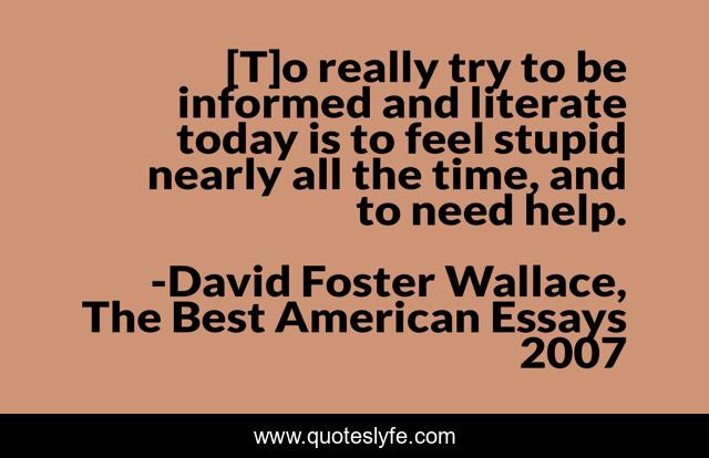 This page presents the quote "[T]o really try to be informed and literate today is to feel stupid nearly all the time, and to need help.". Author of this quote is David Foster Wallace, The Best American Essays 2007. This quote is about humility, literacy,.
