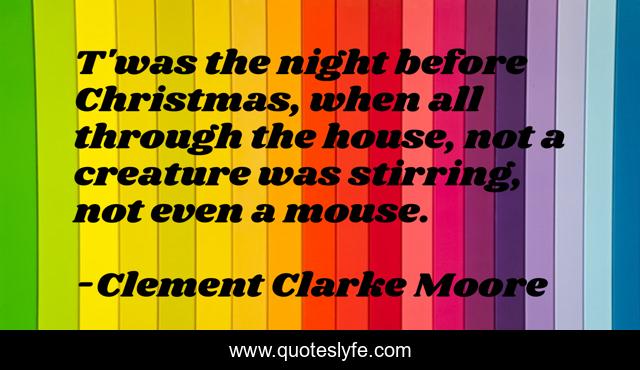 This page presents the quote "T'was the night before Christmas, when all through the house, not a creature was stirring, not even a mouse.". Author of this quote is Clement Clarke Moore. This quote is about house, through, night,.