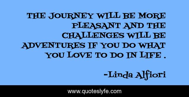 This page presents the quote "THE JOURNEY WILL BE MORE PLEASANT AND THE CHALLENGES WILL BE ADVENTURES IF YOU DO WHAT YOU LOVE TO DO IN LIFE .". Author of this quote is Linda Alfiori. This quote is about purpose-of-life, success, entrepreneurship,.