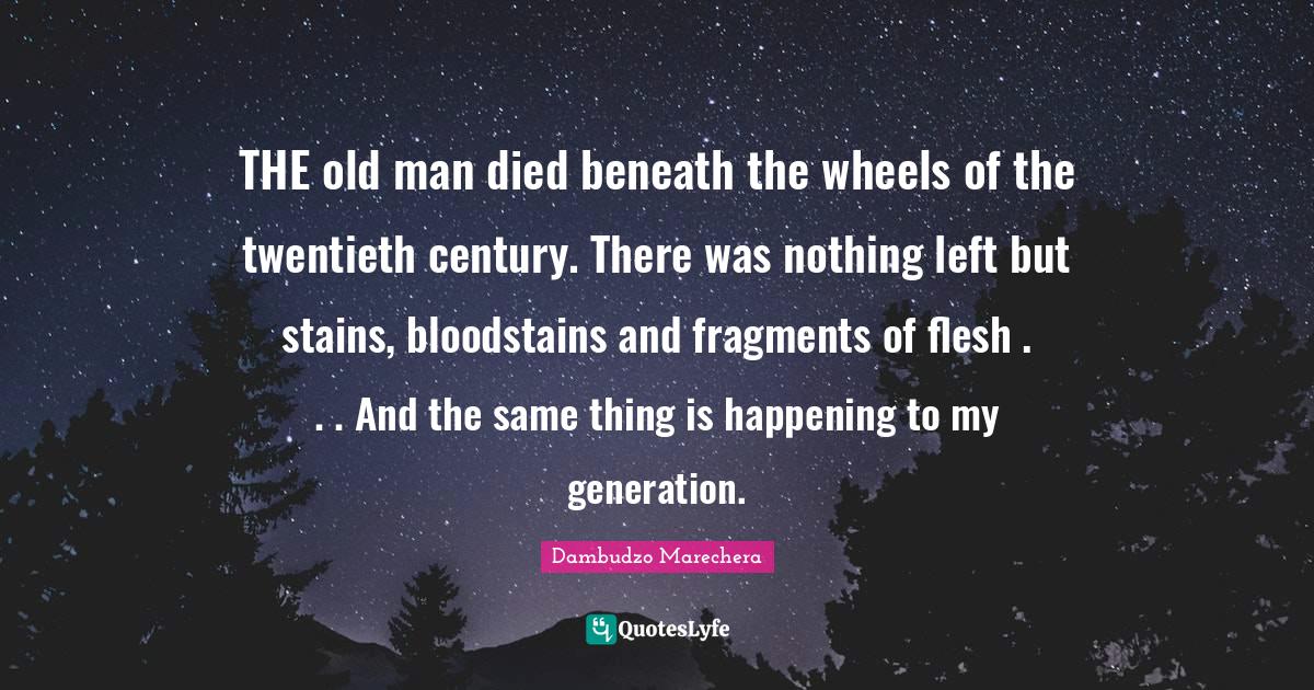 This page presents the quote "THE old man died beneath the wheels of the twentieth century. There was nothing left but stains, bloodstains and fragments of flesh . . . And the same thing is happening to my generation.". Author of this quote is Dambudzo Marechera. This quote is about generations, old man, men, left, wheels, flesh, my generation, stains, twentieth century,.