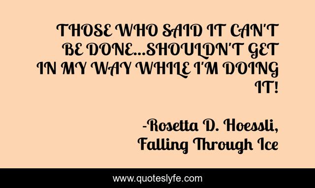 This page presents the quote "THOSE WHO SAID IT CAN'T BE DONE...SHOULDN'T GET IN MY WAY WHILE I'M DOING IT!". Author of this quote is Rosetta D. Hoessli, Falling Through Ice. This quote is about child-abuse, crossover-publications, inspirational, missing-children-s-organizations, llc, enthusiasm,.