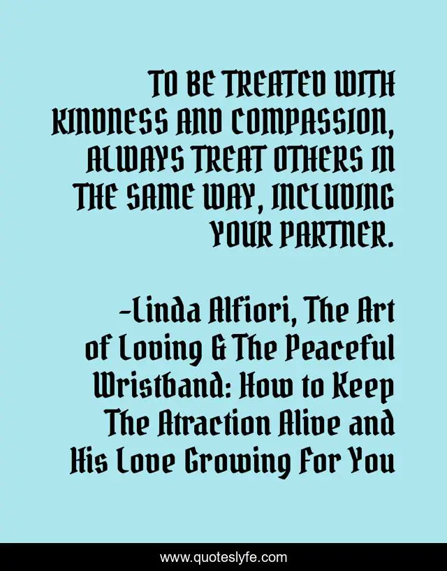 "Linda Alfiori, The Art of Loving & The Peaceful Wristband: How to Keep The Atraction Alive and His Love Growing For You Quotes." Quoteslyfe.com, 2025. Fri. 05 Dec. 2025. <https://www.quoteslyfe.com/quote/TO-BE-TREATED-WITH-KINDNESS-AND-COMPASSION-48716>.