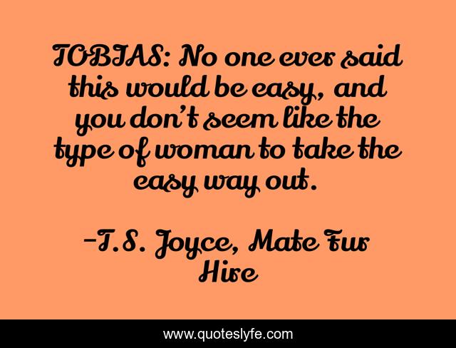 This page presents the quote "TOBIAS: No one ever said this would be easy, and you don’t seem like the type of woman to take the easy way out.". Author of this quote is T.S. Joyce, Mate Fur Hire. This quote is about erotic-romance, shifter-romance, self-help,.