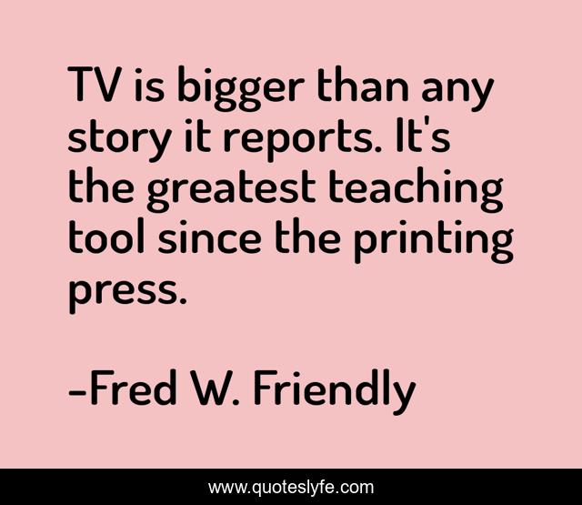 This page presents the quote "TV is bigger than any story it reports. It's the greatest teaching tool since the printing press.". Author of this quote is Fred W. Friendly. This quote is about story, printing, greatest,.