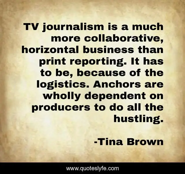 This page presents the quote "TV journalism is a much more collaborative, horizontal business than print reporting. It has to be, because of the logistics. Anchors are wholly dependent on producers to do all the hustling.". Author of this quote is Tina Brown. This quote is about print, logistics, journalism,.