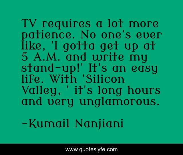 This page presents the quote "TV requires a lot more patience. No one's ever like, 'I gotta get up at 5 A.M. and write my stand-up!' It's an easy life. With 'Silicon Valley, ' it's long hours and very unglamorous.". Author of this quote is Kumail Nanjiani. This quote is about life, long, easy,.
