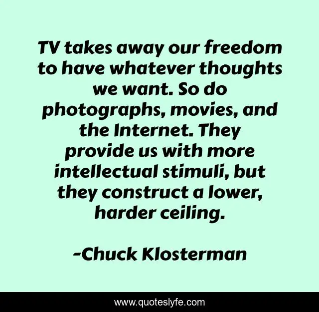 This page presents the quote "TV takes away our freedom to have whatever thoughts we want. So do photographs, movies, and the Internet. They provide us with more intellectual stimuli, but they construct a lower, harder ceiling.". Author of this quote is Chuck Klosterman. This quote is about tv, intelligence, internet, technology, movies,.